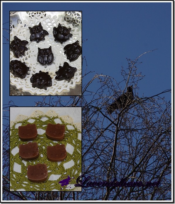 Und die Badepralinen in der Kittyform bestehen wie immer aus viel Kakaobutter und ein wenig Öl und Dermofeel PP, aber hier ist noch sog. Kakaorohmasse enthalten, die für die Farbe sorgt. ![]()