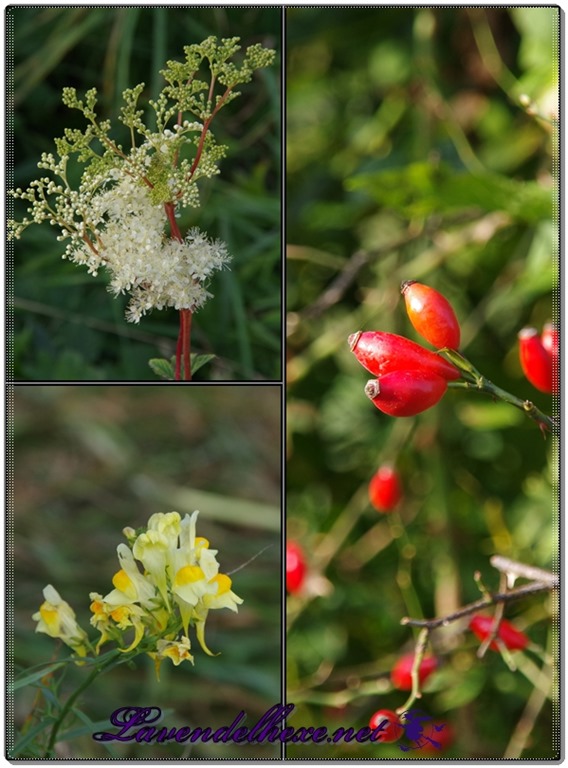 Und nun einige Pflanzen von feuchtem Orte. Mein Mädesüß im Garten blüht schon lange nicht mehr, das hier vermutlich zum 2. Mal (links oben), Hagebutten leuchten in der (meist hinter Wolken verborgenen) Sonne und die gelben Blüten identifizierten wir als Leinkraut. Wir hatten doch tatsächlich das Bestimmungsbuch dabei. ![]()