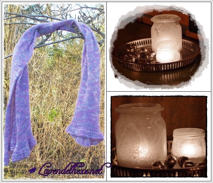 Verstrickt habe ich ein feines Lacegarn gemeinsam mit einem Faden Mohair-Seide. Solch eine Mischung, wenn auch mit nicht ganz so feinem Mohairgarn, nahm ich auch schon  hier und hier. Das Lace besteht je zur Hälfte aus Merinowolle und Seide, LL 730 m/100 g und das Mohair ist ebenfalls ein “halbseidenes” Garn, LL 375 m/25 g.