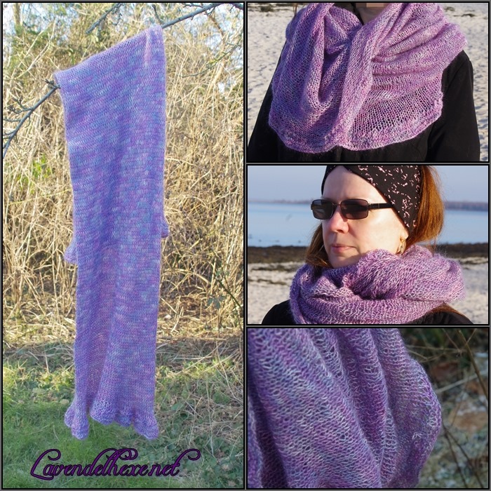 Als Schal, Loop (= auf den Bildern oben locker einfach, darunter doppelt umgelegt), Kapuzenschal, Schulterwärmer und Cape kann man dieses vielseitige Teil tragen. Die Anleitung “Underground Magic”  von Victoria Myers gibt es kostenfrei auf Ravelry. Ein wenig wandelte ich sie ab, indem ich am Anfang und Ende jeweils 5 Reihen kraus rechts mit doppelter Maschenzahl anfügte, damit Anschlag- und Abkettrand auch wirklich locker und dehnbar sind.