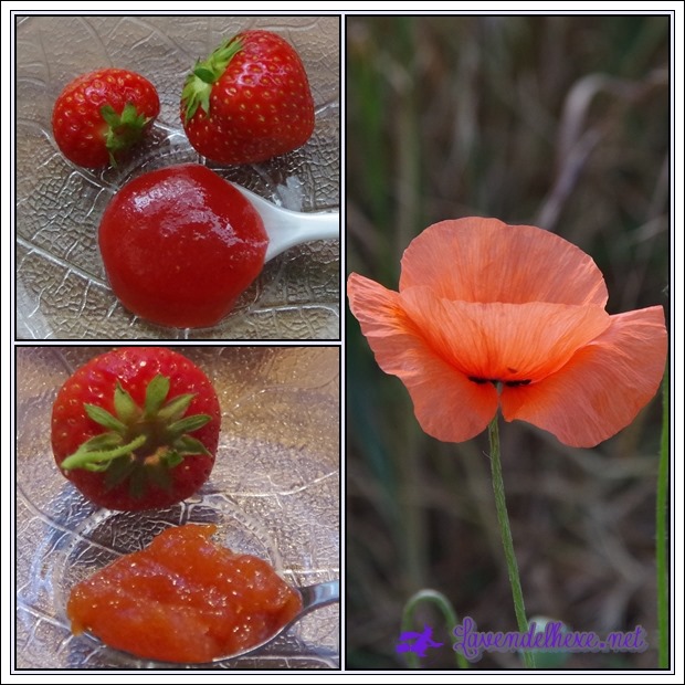 Oben links ist eine roh gerührte pure Erdbeerkonfitüre. Es gibt speziellen Gelierzucker dafür. Sehr lecker, aber nicht lange haltbar. Ich mag die besonders gerne in Quark und Joghurt.