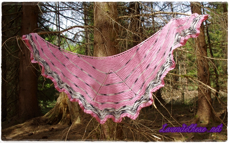 Und der Abschluss sollte natürlich wieder rosa sein: 3 Reihen rechte Maschen, dann abgehäkelt mit *1fM auf die Masche, 1 LM*. Bei mir folgt dann ja oft noch ein kleines Häkelbörtchen, ich finde solche Borten machen ein Tuch so richtig rund und komplett. Hier war es so: *KM in die LM, 4 LM, 1 DStb in dieselbe Masche, 1 LM überspringen*. Meine kryptischen Abkürzungen sind Handarbeitenden vermutlich bekannt. Aber wie immer gilt: bei Fragen einfach fragen. ![]()