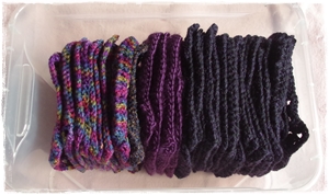 Und nun kommen wir zum Grannyprojekt. Das beende ich hiermit. Ich habe alles verarbeitet, was ich an Garn dafür vorgesehen hatte. Auf dem rechten Bild sind die Reste zu sehen, es ist nur noch sehr wenig. Aber ich mag nichts dafür kaufen und was ich sonst an Polyacryl im Vorrat habe passt farblich überhaupt nicht dazu. Und Wolle oder gar Alpaka möchte ich auch nicht nehmen.