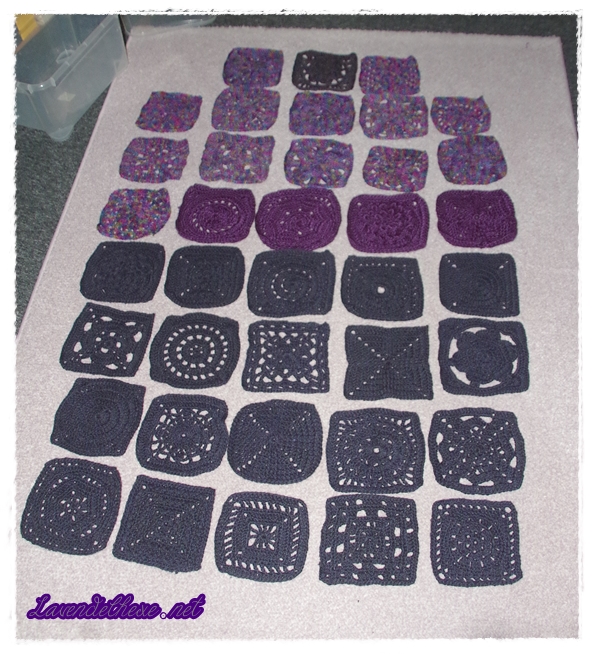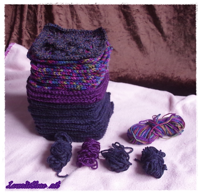 Ein einziges weiteres Garn konnte ich noch verwenden. Das ist ein uraltes Knäuel. Es stammt noch aus dem Besitz meines Großvaters. Wer schon sehr lange hier liest und ein sehr gutes Gedächtnis hat, weiß es: der Mann hatte eine Strickmaschine und natürlich auch Garn, Wollwickler und -haspel und im Lauf der Zeit wanderte dieser Teil seines Erbes zu mir. Ich fand die Garnfarbe (dunkelbunt) zu diesem Projekt passend, auch wenn ich immer noch nicht weiß, was ich eigentlich aus den Teilen machen will. Wobei ich für einige inzwischen schon eine Idee habe. Aber erst einmal dürfen sie eine Runde in der Waschmaschine drehen. Ich habe 38 von 50 Mustern gehäkelt. Und zwar querbeet alles, auch die komplizierteren, weil ich ja davon ausging dass ich sowieso alle häkele. Darunter sind etliche, die ich freiwillig niemals auf den Haken genommen hätte. Also bin ich zufrieden mit mir, auch wenn ich das Ziel nicht erreicht habe.