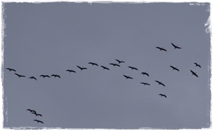Bei leider sehr düsterem Himmel waren wir in der Nähe des Kranichrastplatzes. Das war Zufall, weil wir nicht so furchtbar weit entfernt in einer Kunstausstellung waren. Dann kann man auch gleich noch einige Kilometer weiter fahren und mal gucken. Auf einem Feld standen Kraniche. Die Haltung einiger Tiere sieht seltsam aus, finde ich. Wie ich las, ist in diesem Jahr wohl wieder die Vogelgrippe im Kranichbestand…. Ob diese Tiere krank sind? Es war mittags und nur wenig los. Ein einziger Schwarm zog bei uns vorbei und ein Vogel separierte sich und flog seinen eigenen Weg. Ich hoffe, dass ich bei schönem Wetter nochmal dorthin fahren kann.