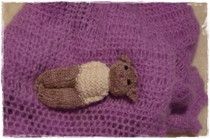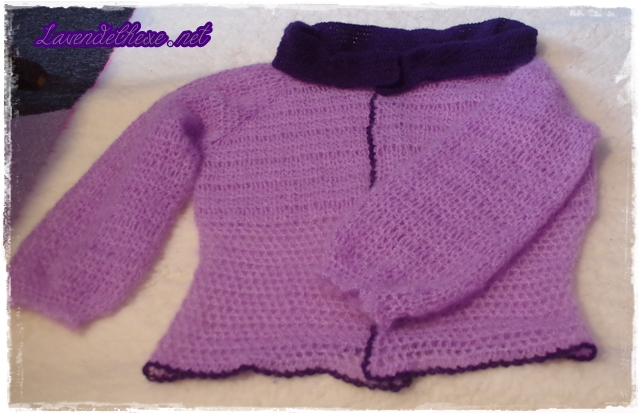 Weil die Kragenfarbe eine andere ist, häkelte ich eine Runde „liegende Stäbchen“ um die Ränder der gesamten Jacke. Insgesamt bin ich zufrieden, aber auch dieses Mal habe ich eine Menge gelernt. Das Hauptgarn ist Super Kid Silk von Mayflower, ein „klassisches“ feines Garn aus 76 % Mohair und 24 % Seide mit einer Lauflänge von 195 Metern auf 25 Gramm. Für den Kragen nahm ich das herrlich weiche Superior von Filatura di Crosa, bestehend aus 70 % Kaschmir, 25 % Seide und 5 % Wolle. Die Lauflänge ist mit 300 Metern auf 25 Gramm etwas höher als beim Mohair.