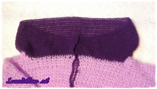 Der Kragen war von Anfang an aus dem Kaschmirgarn vorgesehen. Ich wollte einen richtig kuscheligen, warmen, großen Kragen. Die Form entstand mit verkürzten Reihen. Sowas kann man nämlich auch häkeln. Auf dem rechten Bild liegt die Jacke ganz gerade und man kann gut sehen, dass der Kragen vorne viel niedriger ist als im hinteren Bereich.