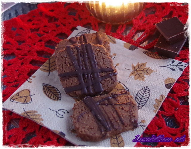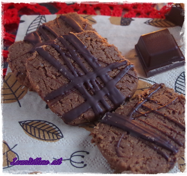 Während die Kekse dann abkühlen, werden 100 Gramm Schokolade (ich: immer Zartbitter) oder Kuvertüre geschmolzen. Vielleicht sogar in der Restwärme des Backofens. Dann geht es ans dekorieren. Ich habe die flüssige Schoki mit einem Löffel über die Kekse in möglichst langen Streifen gegossen. Natürlich fielen auch dicke Tropfen. Aber es spricht ja nichts gegen ordentliche Schokoladentupfen auf einem Keks.