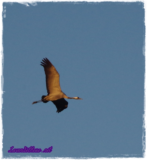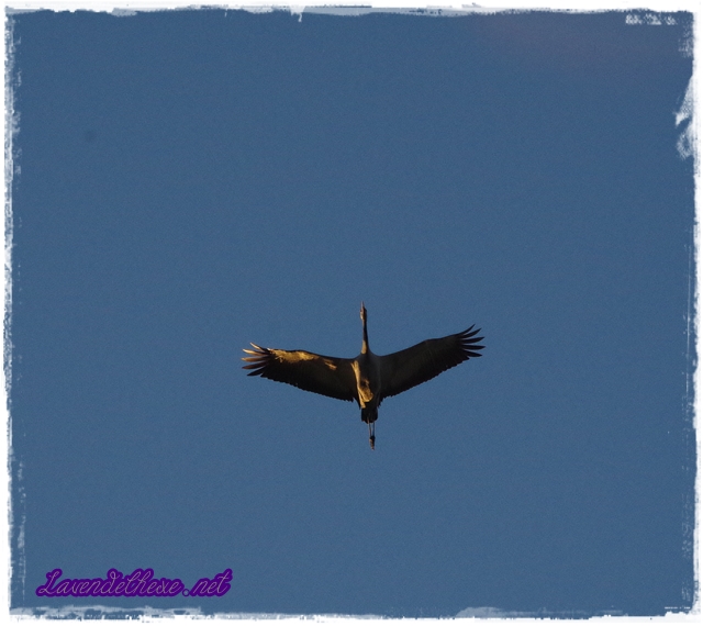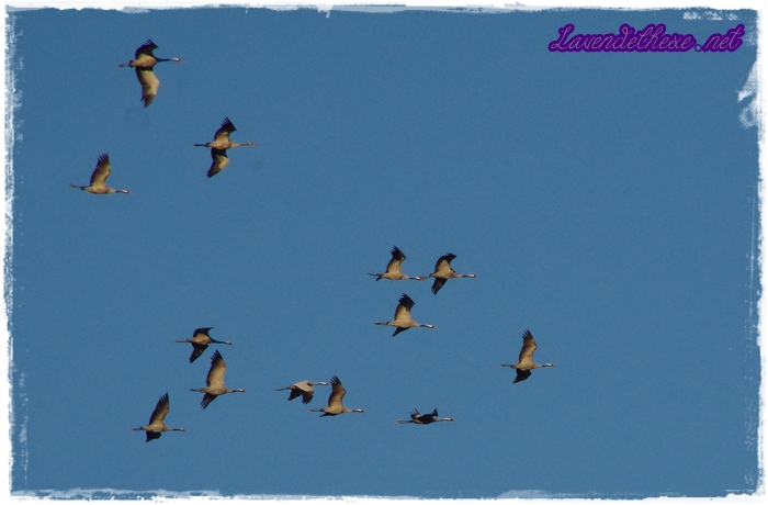 Und dann war da noch der einzelne Kranich, der über dem Feld vor uns einige Runden drehte, dann die Straße überflog und auf der anderen Seite weit hinter dem Gebüschstreifen auf dem Acker landete. Dort blieb er stehen. Wir waren noch ein ganzes Weilchen dort und ich guckte immer mal hinüber. Er stand da noch, als wir schließlich durchgefroren waren und wieder ins Auto stiegen. Das ist für einen Kranich ein sehr ungewöhnliches Verhalten. Ich vermute, dass er schon krank war. Die Vogelgrippe ist ja leider sehr heftig in diesem Jahr. Wir sahen zwar keine toten Vögel, worüber ich froh bin. Aber es sind schon einige Hundert inzwischen, auch unser Landkreis ist nun betroffen…