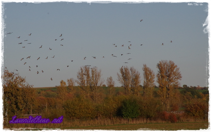 Denn ein Blick auf eine Wetter-App brachte die Erkenntnis, dass es sich lohnen könnte, zum Kranichrastplatz zu fahren. Es ist schon einige Tage her und war schon spät am Nachmittag als Herr Lavendelhexe mit dieser Information zu mir kam. Also spontan beschlossen: wir fahren. Eigentlich wollte ich an einen anderen Standort, aber durch Bauarbeiten und Umleitungen war der Weg viel zu umständlich. Daher standen wir am selben Platz wie neulich, als ein einziger Schwarm sich sehen ließ.