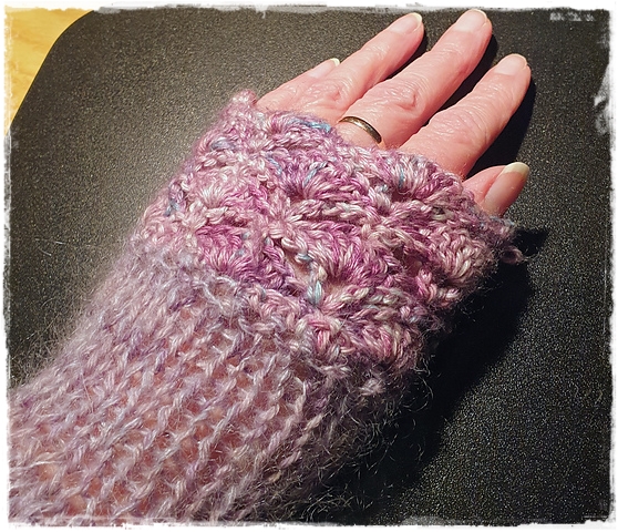 Und ganz zum Schluss, als eigentlich alles schon fertig war, häkelte ich noch eine breite Borte als Pulswärmer an die Ärmel. Dafür nahm ich allerdings kein Mohair, weil ich das flusige Zeug am Esstisch etwas unpraktisch finde. Aber die Ärmel sind nun lang genug, dass sie wie Pulswärmer runtergezogen werden können und herrlich wärmen. Die ganze Jacke ist wunderbar warm! Sie besteht ja aus Mohair und Wollmischgarnen. Ich bin schwer begeistert.