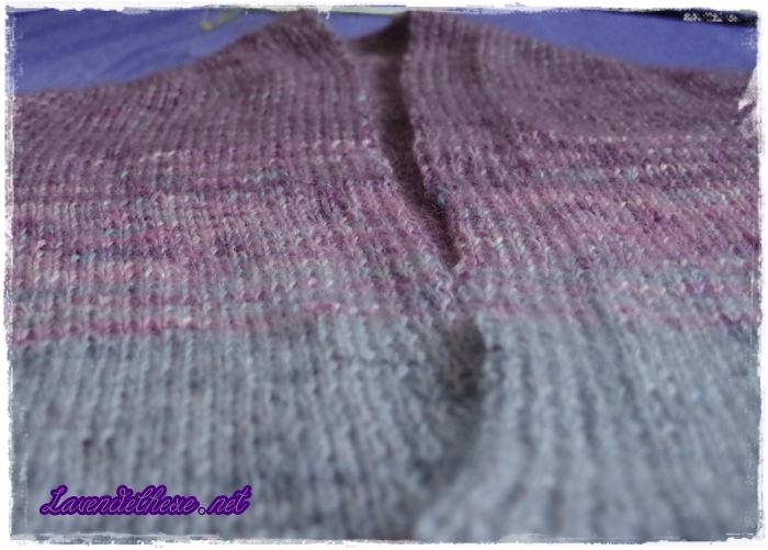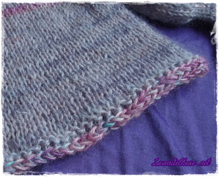 Weil ich nur Garne nahm, die schon einmal verarbeitet waren (also geribbeltes), hatte ich eine sehr begrenzte Auswahl und musste sehen, wie ich die Farben einteile. Daher strickte ich kurz nach dem abteilen der Ärmel auch erst diese zu einer vernünftigen Länge, ehe ich das restliche blau-graue Garn komplett für den Körperteil verbrauchte. Zum abketten reichte dann ein Restchen der mittleren Farbe gerade so. Es blieben ungefähr 20 Zentimeter übrig, was zum vernähen natürlich ausreichend ist. Ich spielte also „Yarn Chicken“ und gewann.