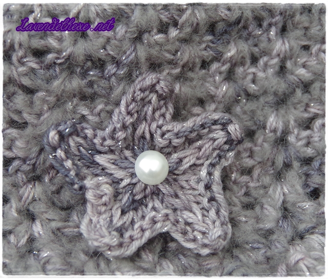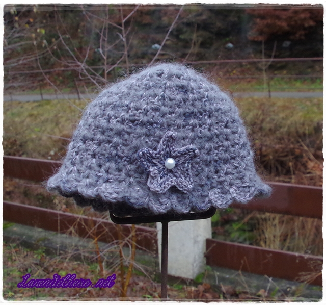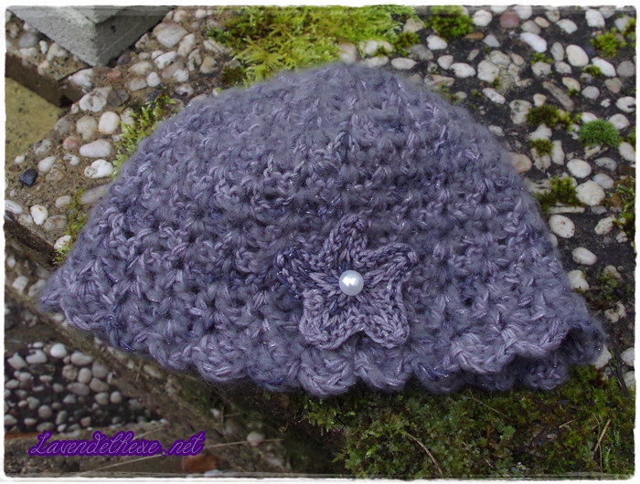 kommt nun. Denn ich war fleißig und habe einige Kleinteile gehäkelt und gestrickt, aber hier noch nicht gezeigt. Das hole ich jetzt also nach. Fangen wir mit einer Mütze an. Wieder nach demselben Muster gehäkelt wie schon einige Male. Ich mag die Form und finde, sie steht mir. Das Garn besteht aus zwei Fäden. Eins ist eine Sockenwolle mit Glitzer, handgefärbt, die ich in einer Kunsthandwerkerausstellung erwarb. Die Färberin steht nicht auf dem Etikett. Der Stern ist nur aus dieser Glitzerwolle mit einem Knopf in der Mitte. Der andere Faden ist ein dickes Mohairgarn, von dem ich das Etikett verlegt habe.