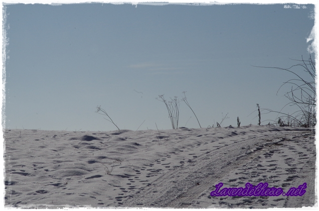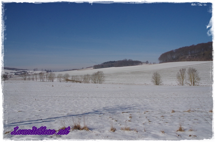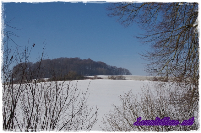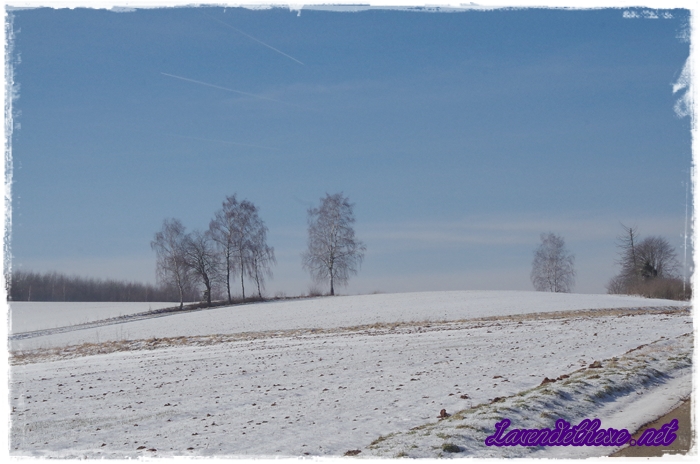 Die Landschaft ist hübsch überzuckert, die Sonne strahlt – fehlen nur noch Vögel. Raben oder Kraniche wären schön. Aber die waren alle unwillig. Kraniche ganz weit oben ließen sich bei unserer zweiten Runde hören. Das war schön. Und warum eine zweite Runde? Weil etwas verloren ging. Aber letztlich wurde es gefunden – wenn auch nicht von uns – und gelangte auf einem kleinen Umweg wieder zu seinem Besitzer.