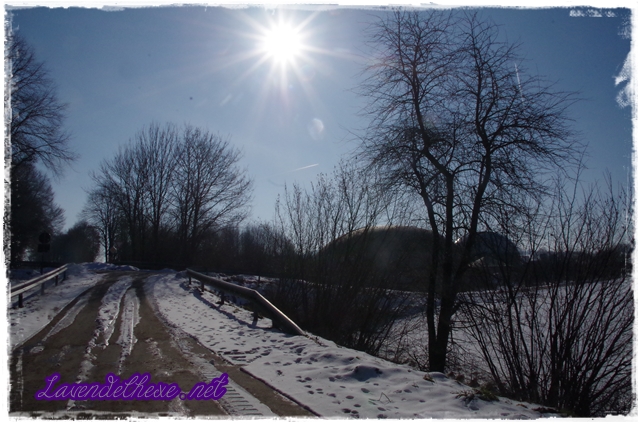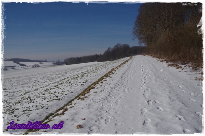 Die Sonne lachte vom Himmel, also Wanderschuhe anziehen, zur dicken Winterjacke, warmem Cowl und Wollmütze greifen, die Handschuhe nicht vergessen und raus. Erstmal ins Auto und ein paar Kilometer fahren. Dort sind viele Wege geteert und teilweise auch gut befahren, so dass kaum noch Schnee und Eis darauf liegen, was das Gehen sehr erleichtert. Andererseits: auf den Wegen mit etwas Schnee, in den man einsinkt, benutzt man Muskeln, die selten so intensiv in Gebrauch sind.