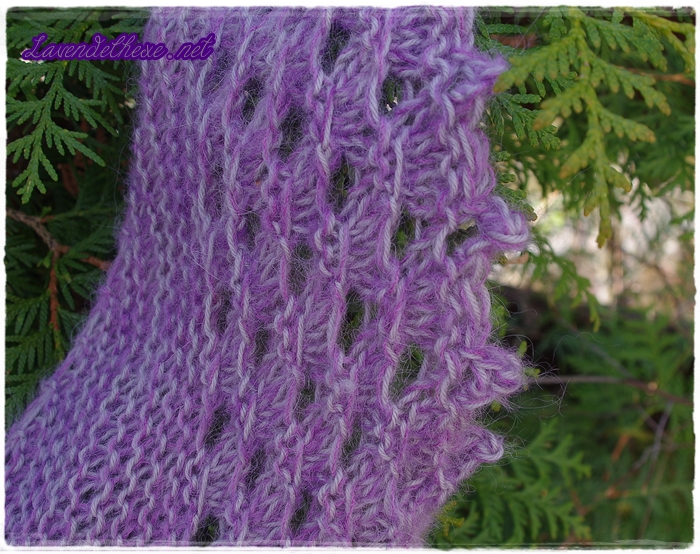 Und dann zeige ich noch ein kleines Halstuch. Es entstand aus den Restgarnen der letzten Strickjacke. Hellgraues Merino-Yak-Garn und hellvioletter Alpaka-Seide-Mix zusammen verstrickte ich nach der Anleitung „Wisteria Flower“ von Linda Allegra (Link zu Ravelry, aber die Anleitung ist nicht mehr erhältlich). Wobei ich ja nur eine kleine Garnmenge hatte und daher den ersten Teil des Tuches – kraus rechts mit Zunahmen – nur kurz strickte. Das Hauptmuster veränderte ich ein wenig (die 4. Reihe jeweils rechte Maschen statt linker), so dass es sich nicht einrollt und ich auf die Abschlussreihen verzichten konnte. Außerdem kettete ich mit Picots ab, weil am Rand auch Picots gestrickt werden. Ein hübsches kleines Projekt und eine wunderbare Resteverwertung.