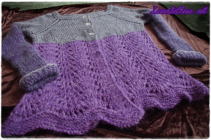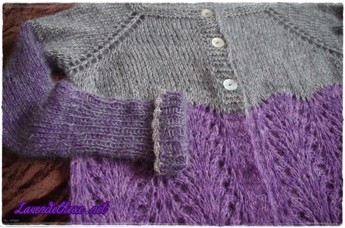Meine Garne sind: Yak von Zitron (70 % Merino, 30 % Yak, LL 500 m/100 g) in violett und grau. Im oberen Bereich als Zweitfaden die Superkid Seta von Lana Grossa (65 % Mohair, 35 % Seide, LL 100 m/25 g). Davon hatte ich zwei Knäule in grau und die sind beide verbraucht. Daher wählte ich für die Ärmel ein feines, ebenfalls graues Silkhair, auch von Lana Grossa (70 % Mohair, 30 % Seide, LL 210 m/25 g) zusammen mit dem violetten Yak. Im unteren Teil ist dasselbe Yak mit einem handgefärbten Alpaka-Seide-Mix verarbeitet (65 % Suri Alpaka/35 % Seide, LL 400 m/50 g). Nun ist noch etwas Yak in grau und Alpaka in violett übrig und die werden zu einem kleinen Tuch verstrickt. Das kann bei Bedarf den Hals wärmen, weil die Jacke ohne Kragen ist. Die Handfärberin ist nicht mehr aktiv, daher keine Angabe.